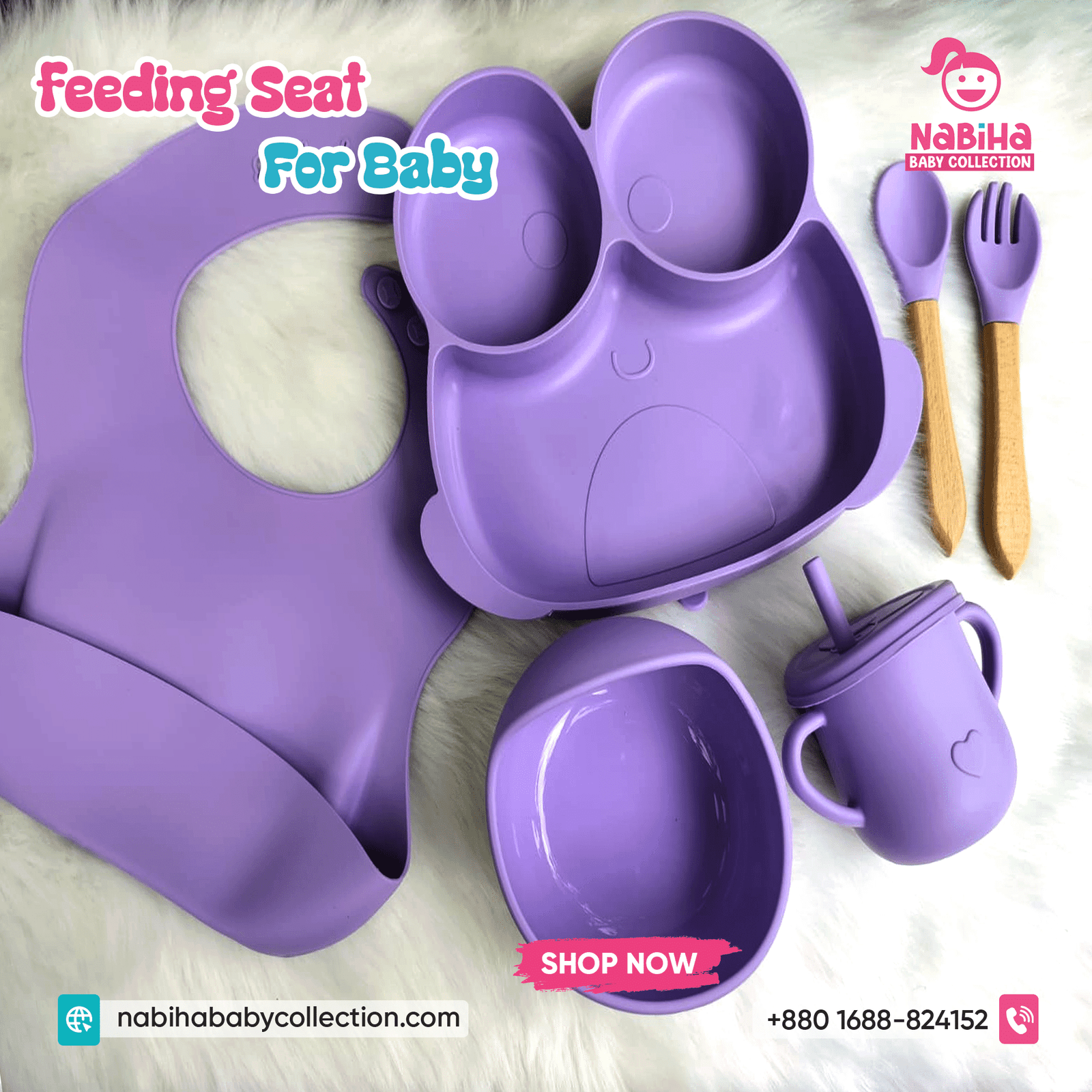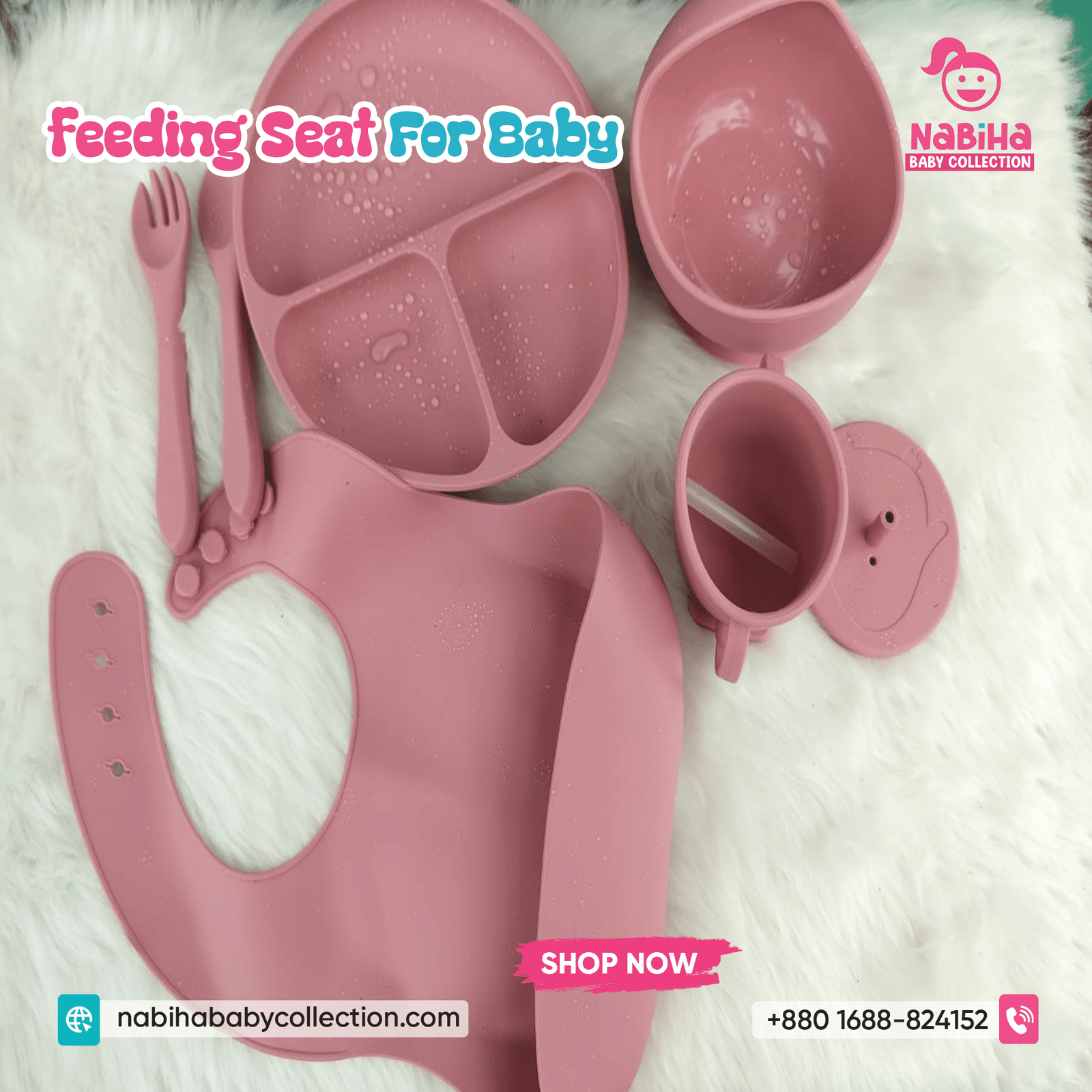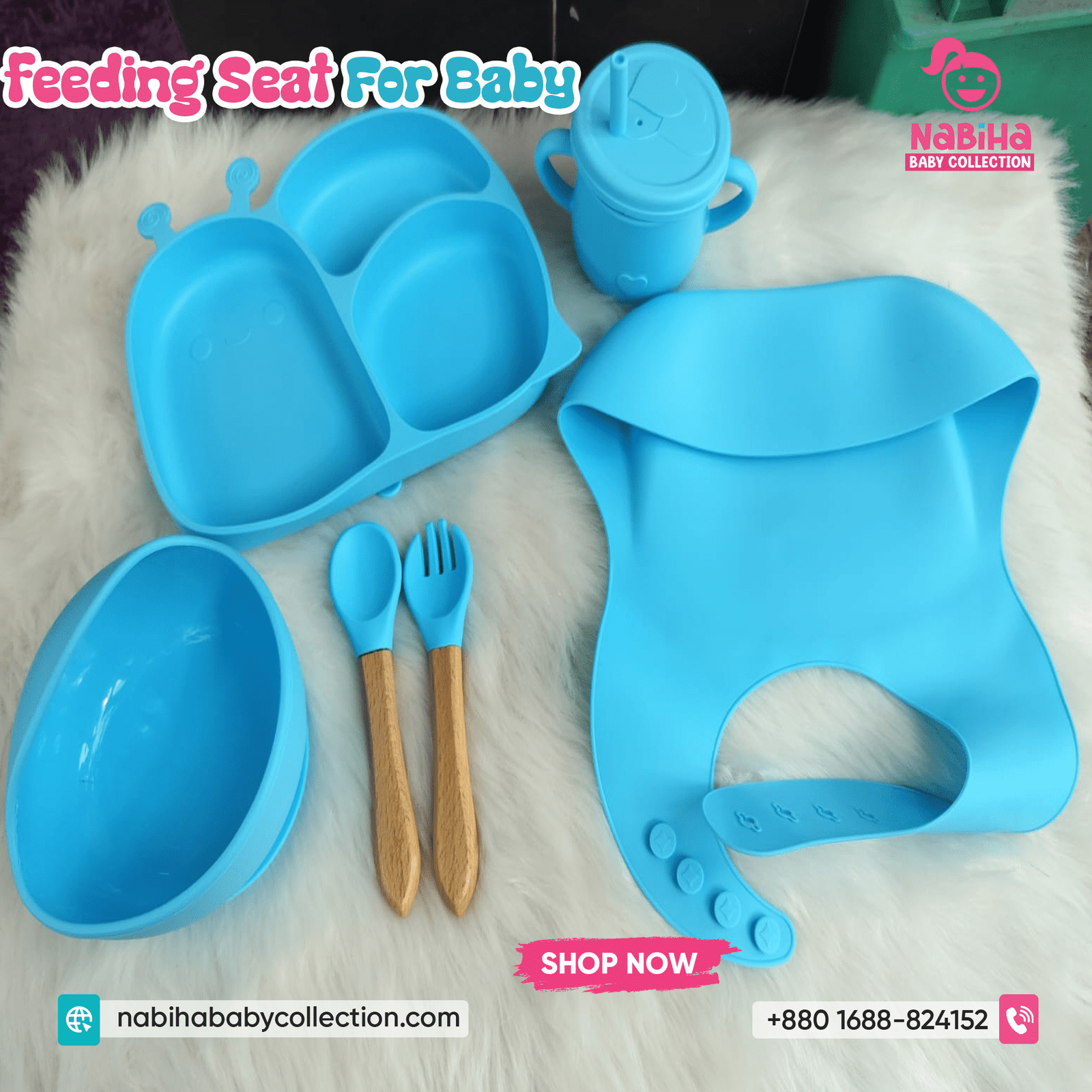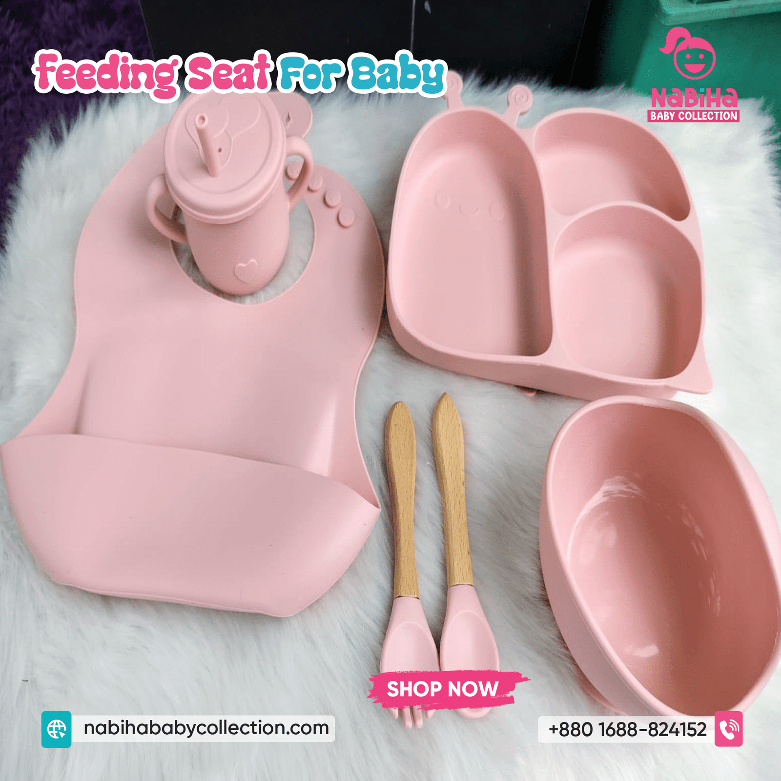 “Hi Nabiha Baby Collection, ami ‘Baby Feeding Set — 8pc’ nite chai. Color: [Pink/Baby Pink/Blue/Mint/Grey/…], Qty: 1. Delivery: [Dhaka/Outside]. Amar naam—, phone—, address—. Note: Dhaka ৳70, Outside ৳120. Rider-er samne parts check korbo. Hygiene policy bujhte perechi.
