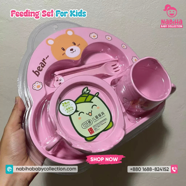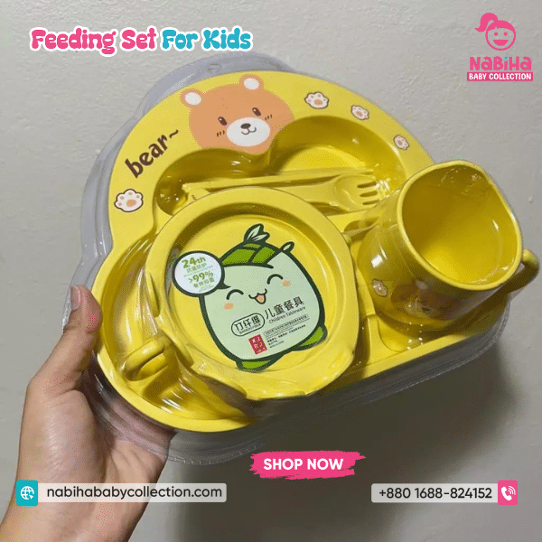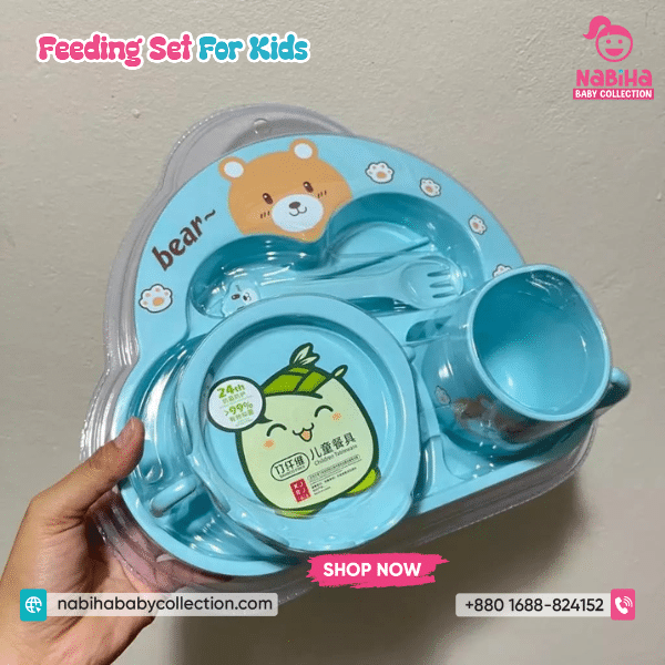 “Hi Nabiha Baby Collection, ami ‘Bear Design Divided Feeding Set’ nite chai. Color: [Blue/Green/Yellow/Pink], Qty: 1. Delivery: [Dhaka/Outside]. Amar naam—, phone—, address—. Note: Dhaka ৳70, Outside ৳120. Rider-er samne parts check korbo. Hygiene policy bujhte perechi.