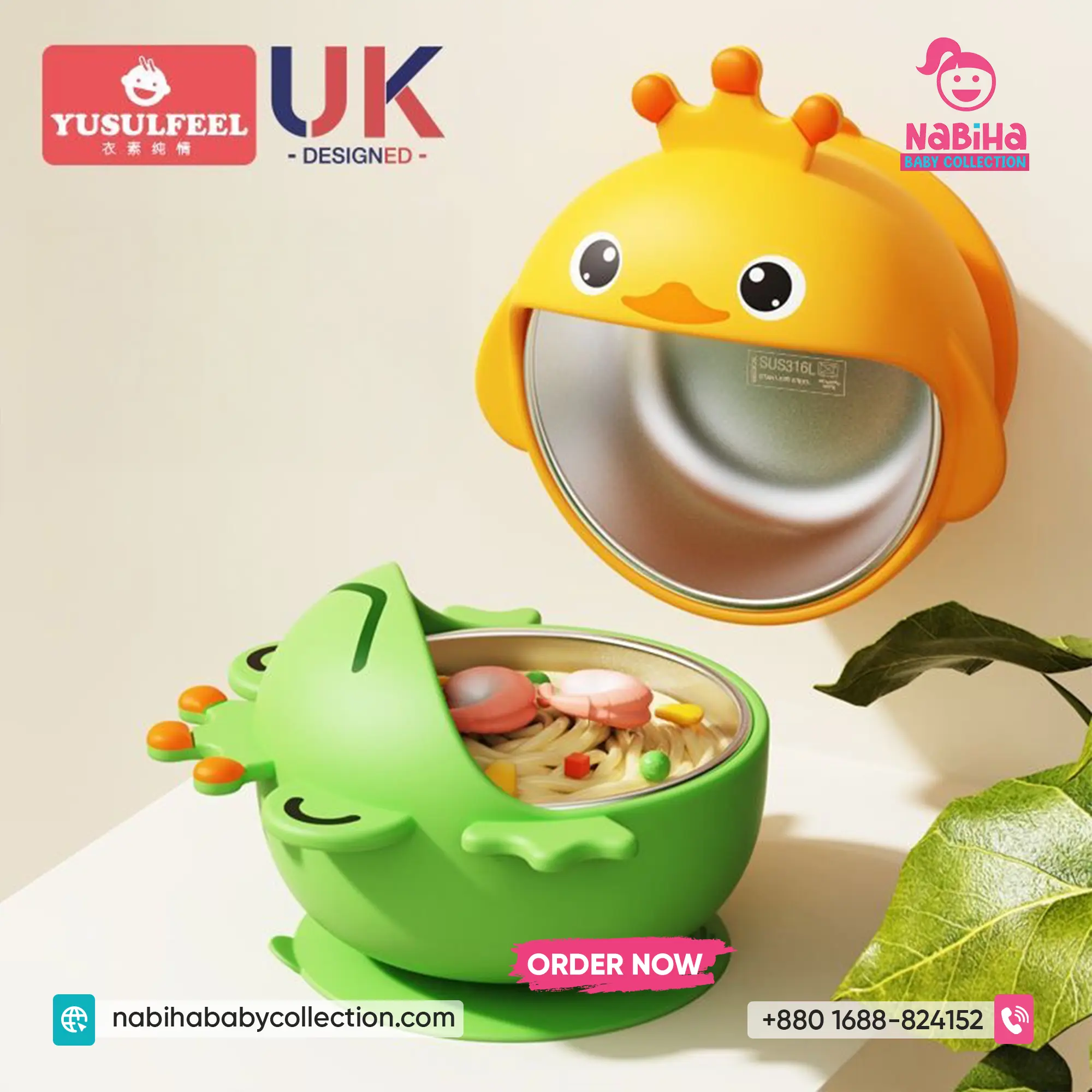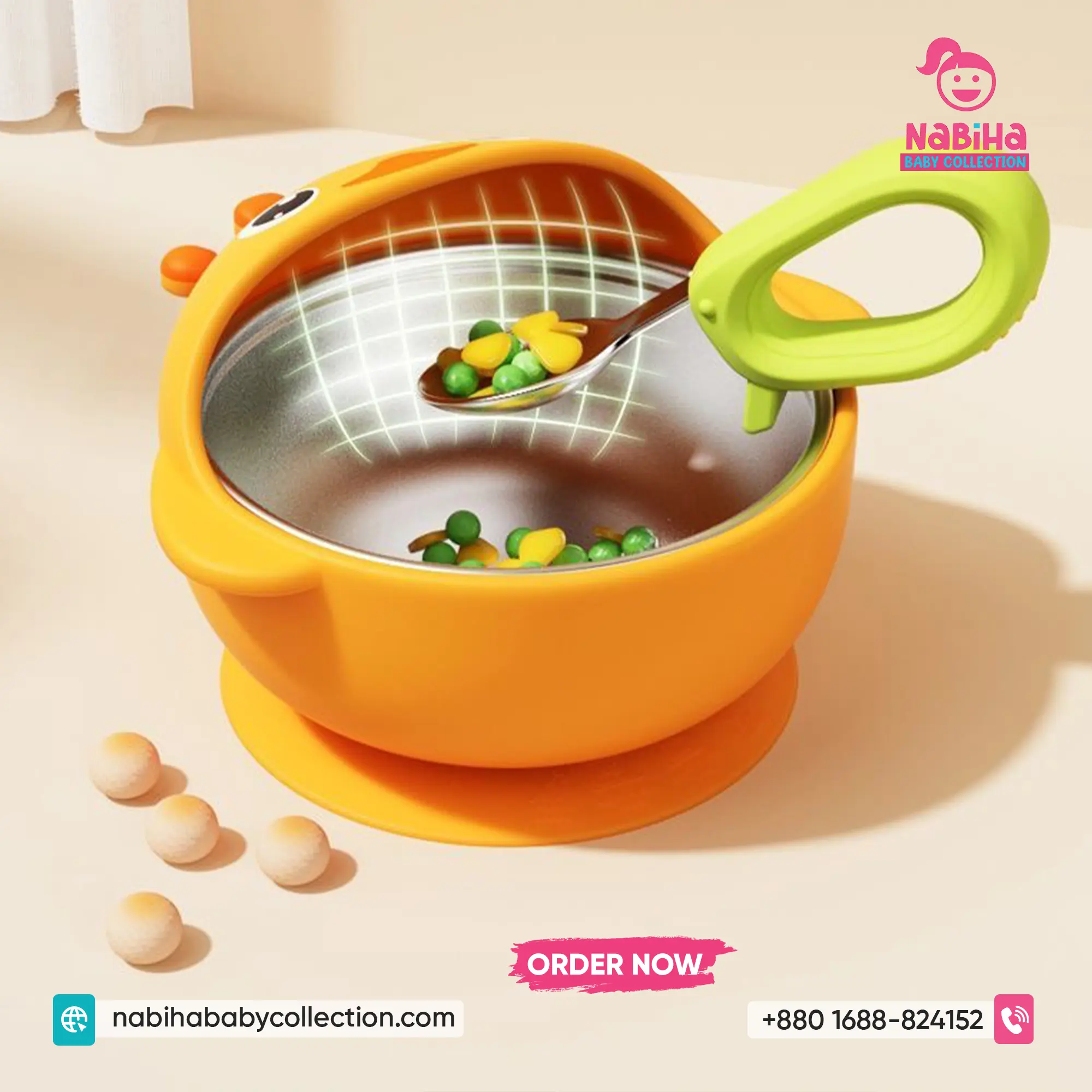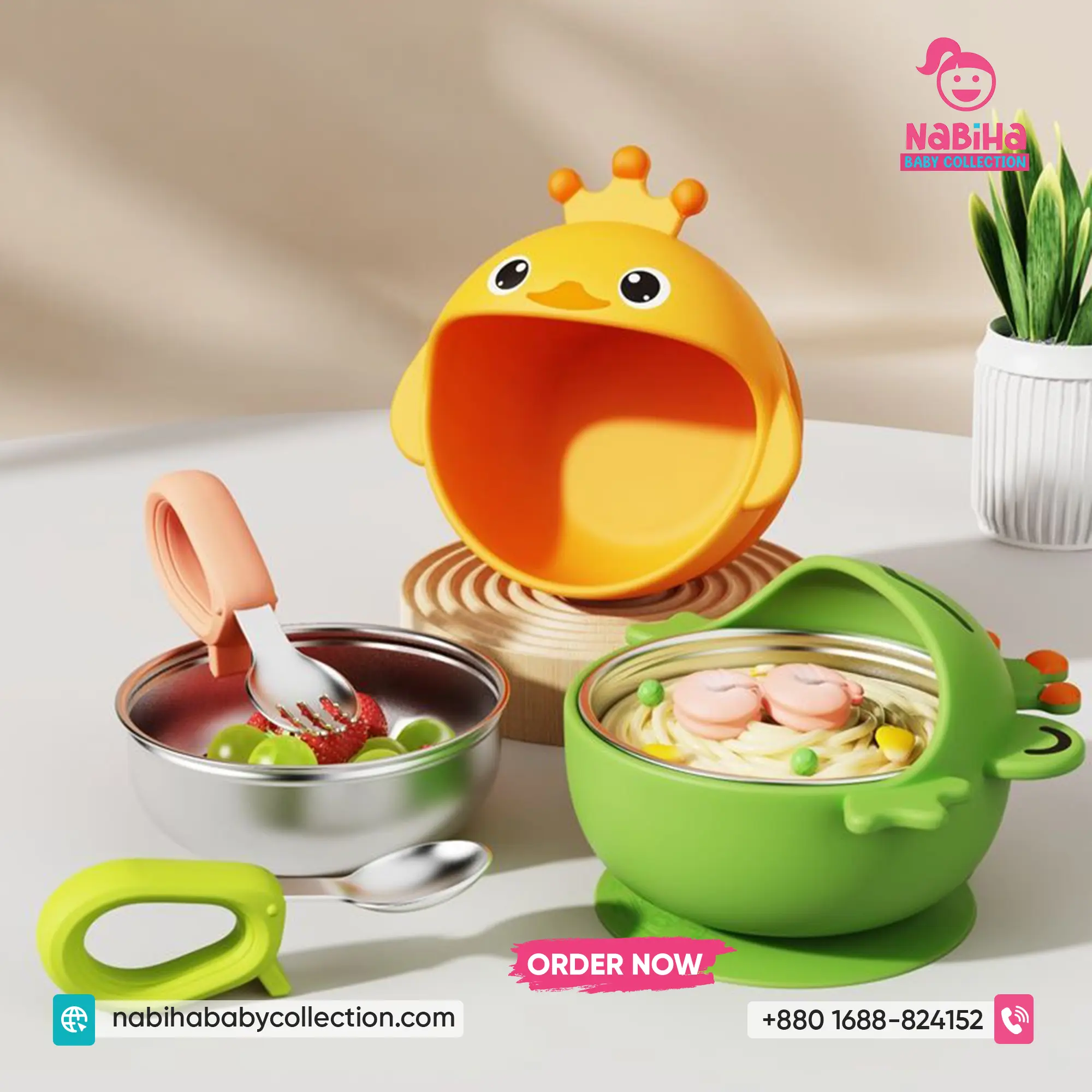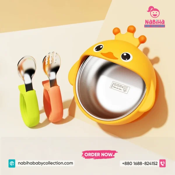 Product Overview: বাচ্চাদের খাওয়ানোর সময়টা এখন হবে আরও মজার এবং ঝামেলাহীন! Nabiha Baby Collection নিয়ে এলো কিউট হাঁস এবং ব্যাঙ ডিজাইনের সাকশন বোল সেট। এর নিচে থাকা শক্তিশালী সাকশন বাটিটিকে টেবিলের সাথে আটকে রাখে, তাই বাচ্চারা দুষ্টুমি করলেও খাবার পড়ে যাওয়ার ভয় নেই। ভেতরের স্টেইনলেস স্টিল খাবারকে রাখে স্বাস্থ্যকর এবং উষ্ণ।