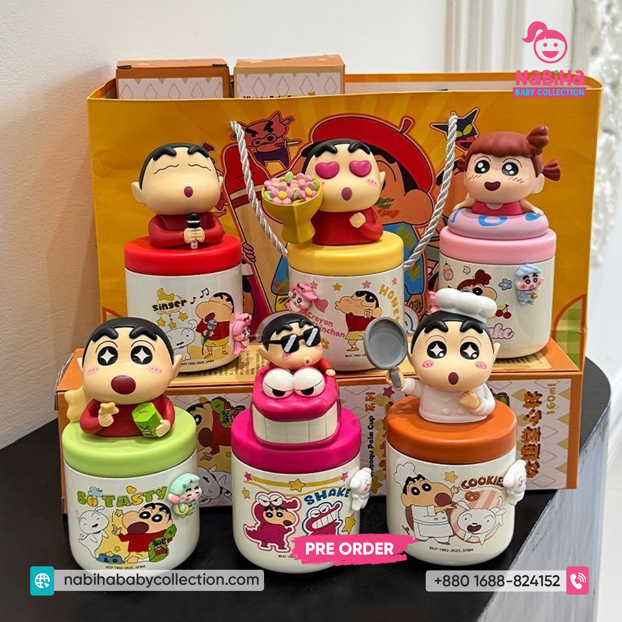 3D Character Design: ঢাকনার ওপর কিউট Crayon Shin-chan এর বিভিন্ন থ্রি-ডি ক্যারেক্টার (Singer, Chef, Tasty, etc.) রয়েছে যা দেখলেই মন ভালো হয়ে যায়।
