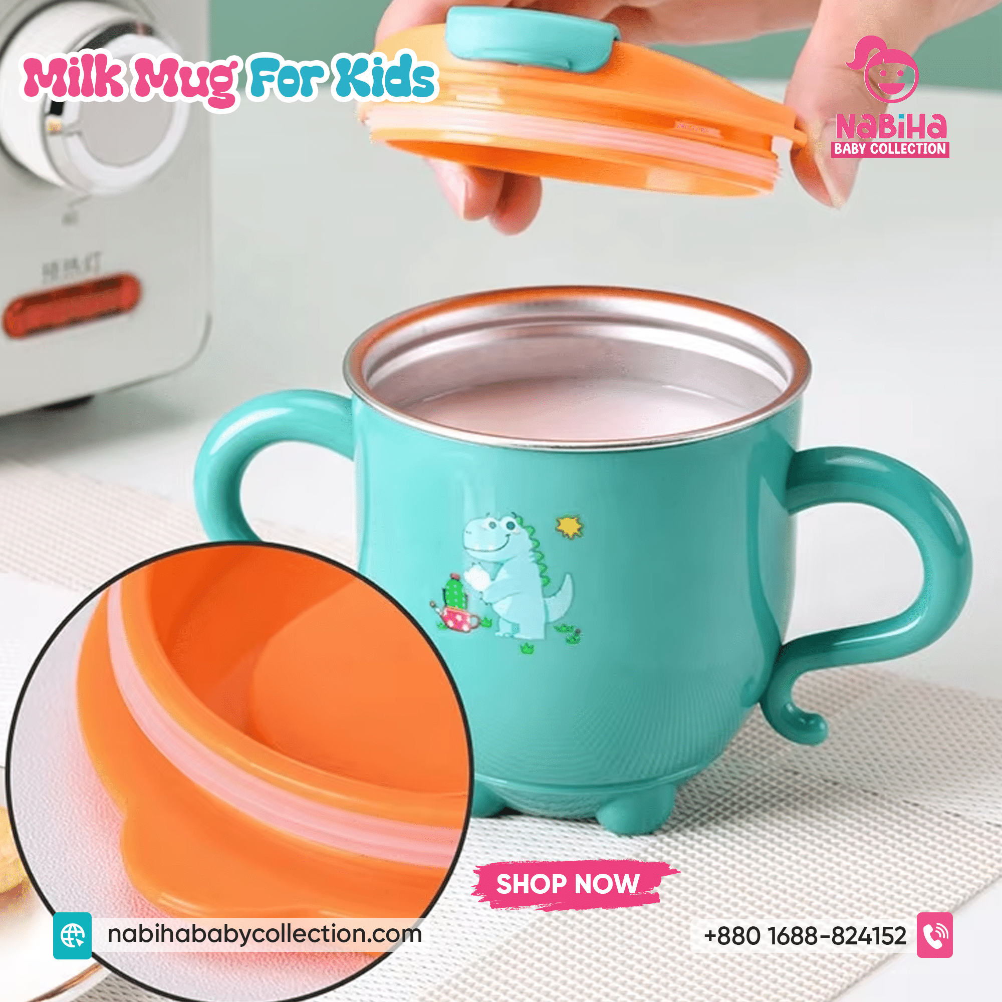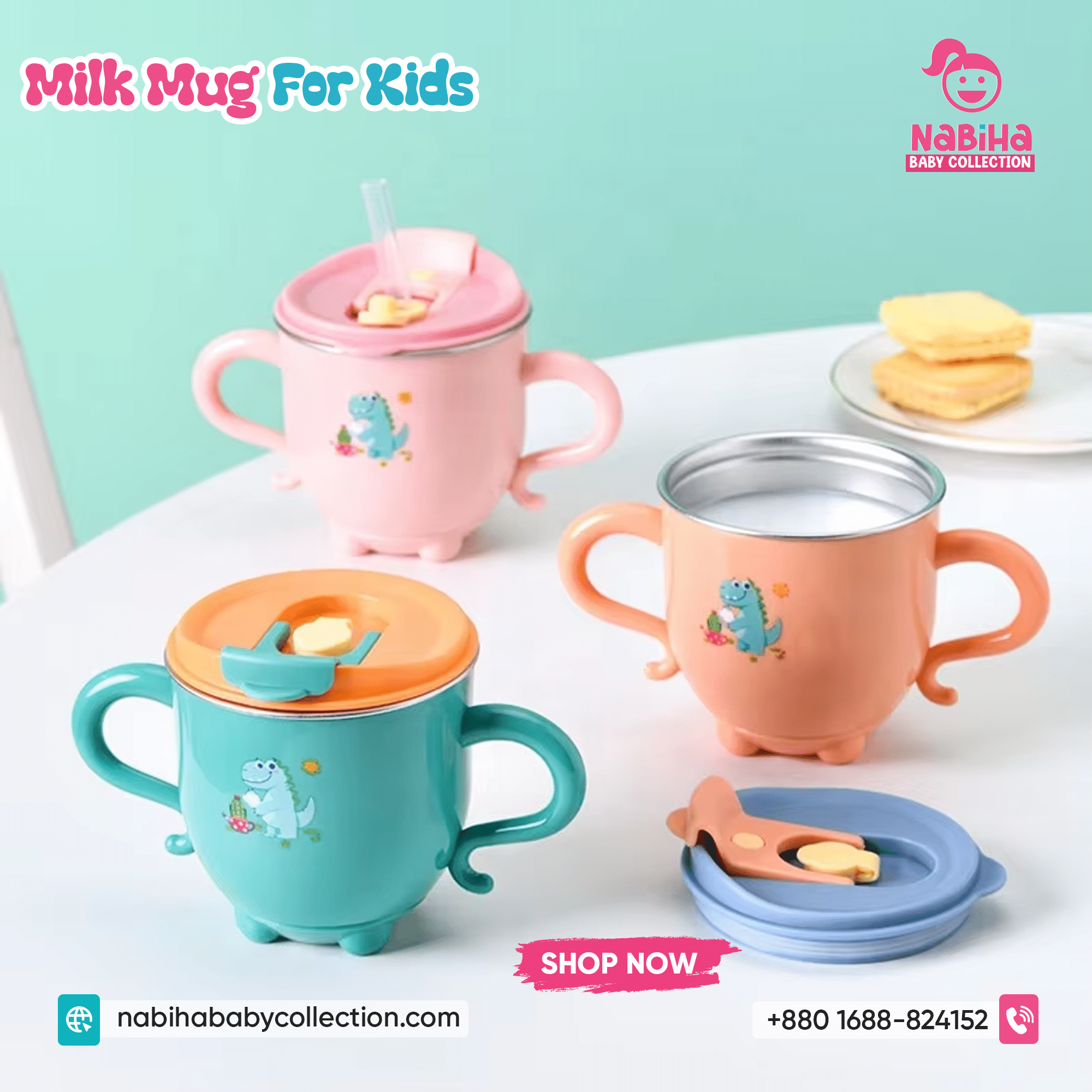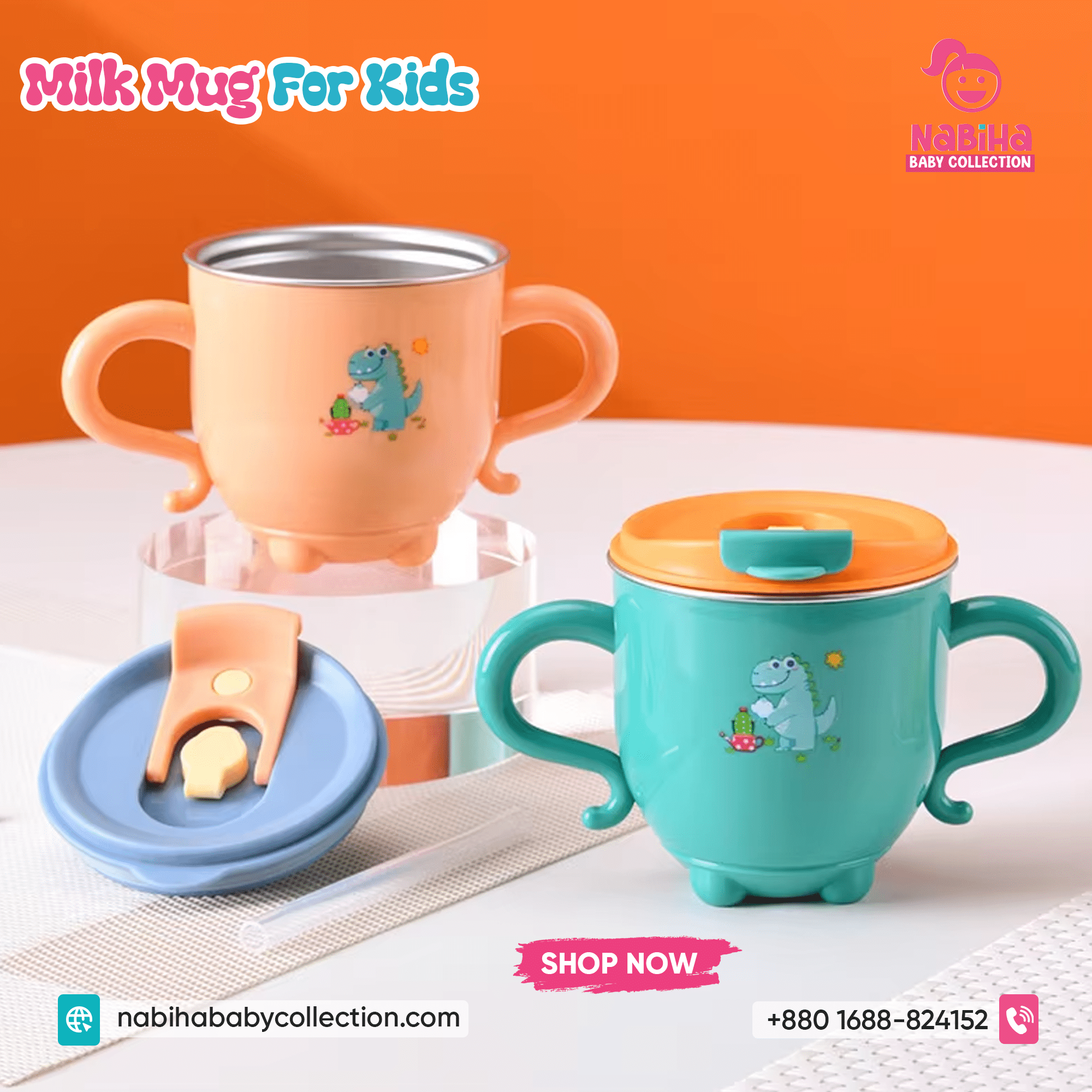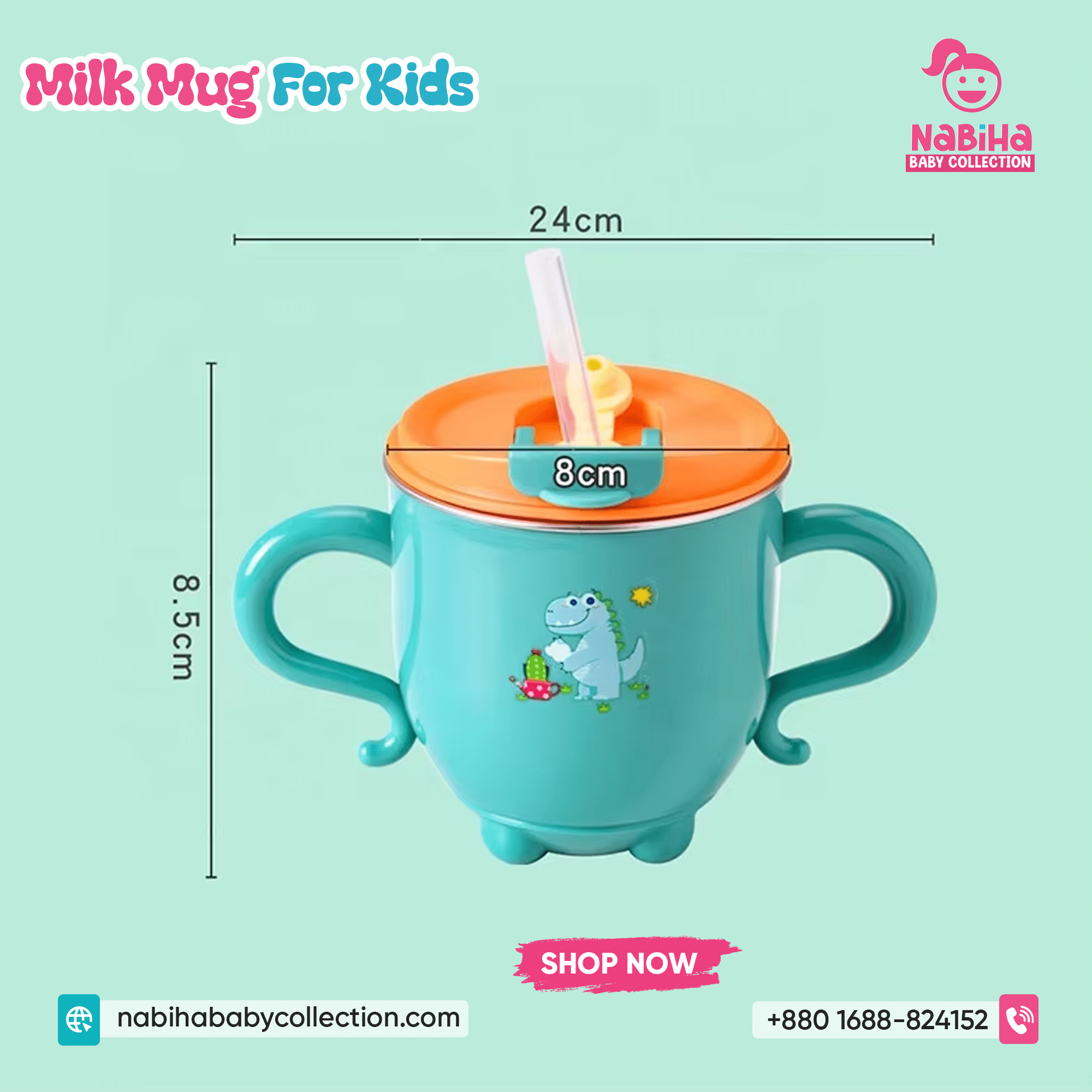 “Hi Nabiha Baby Collection, ami ‘Dinosaur Kids Water & Milk Mug’ nite chai. Color: [Green/Orange/Pink], Qty: 1. Delivery: [Dhaka/Outside]. Amar naam—, phone—, address—. Note: Dhaka ৳70, Outside ৳120. Rider-er samne check korbo. Hygiene policy bujhte perechi.