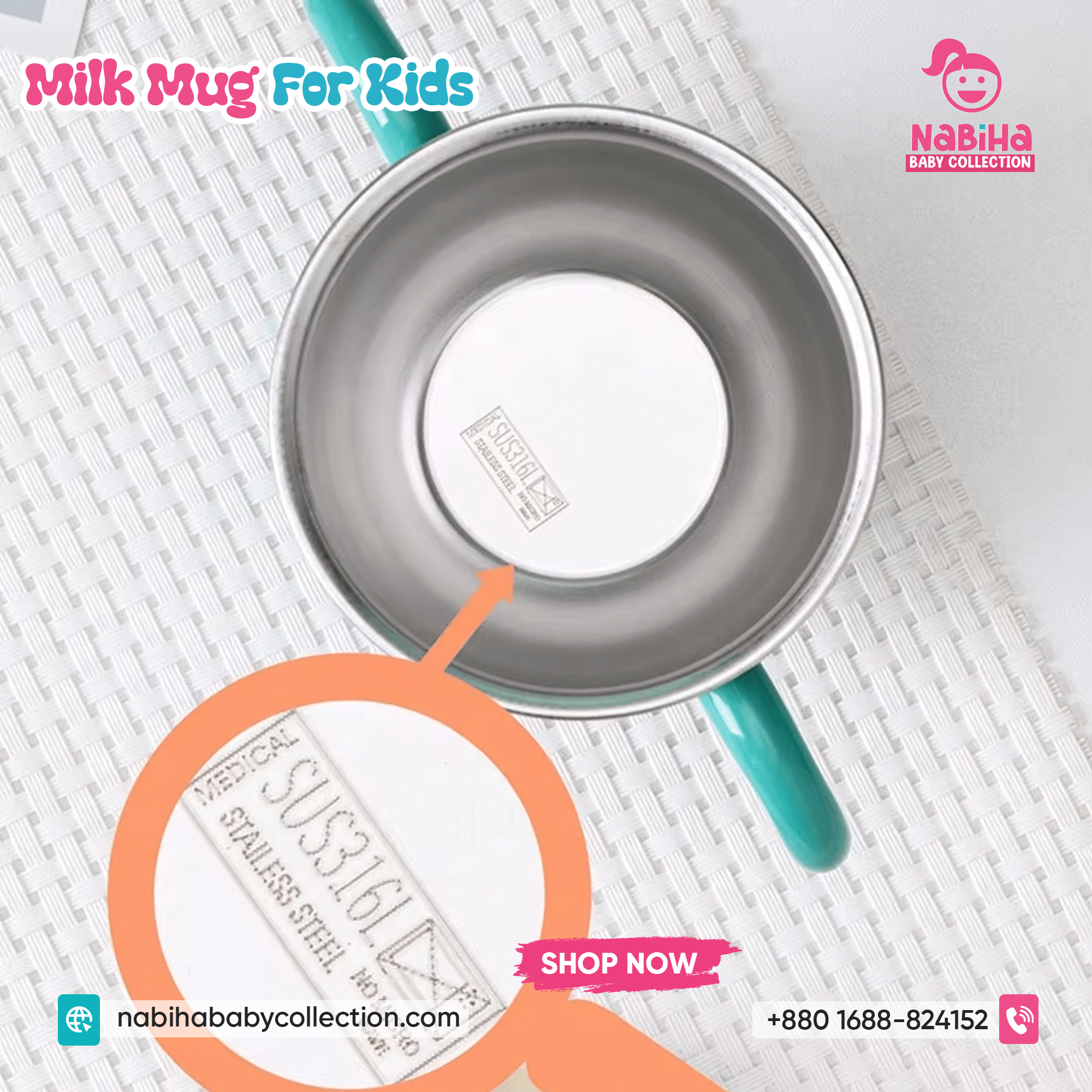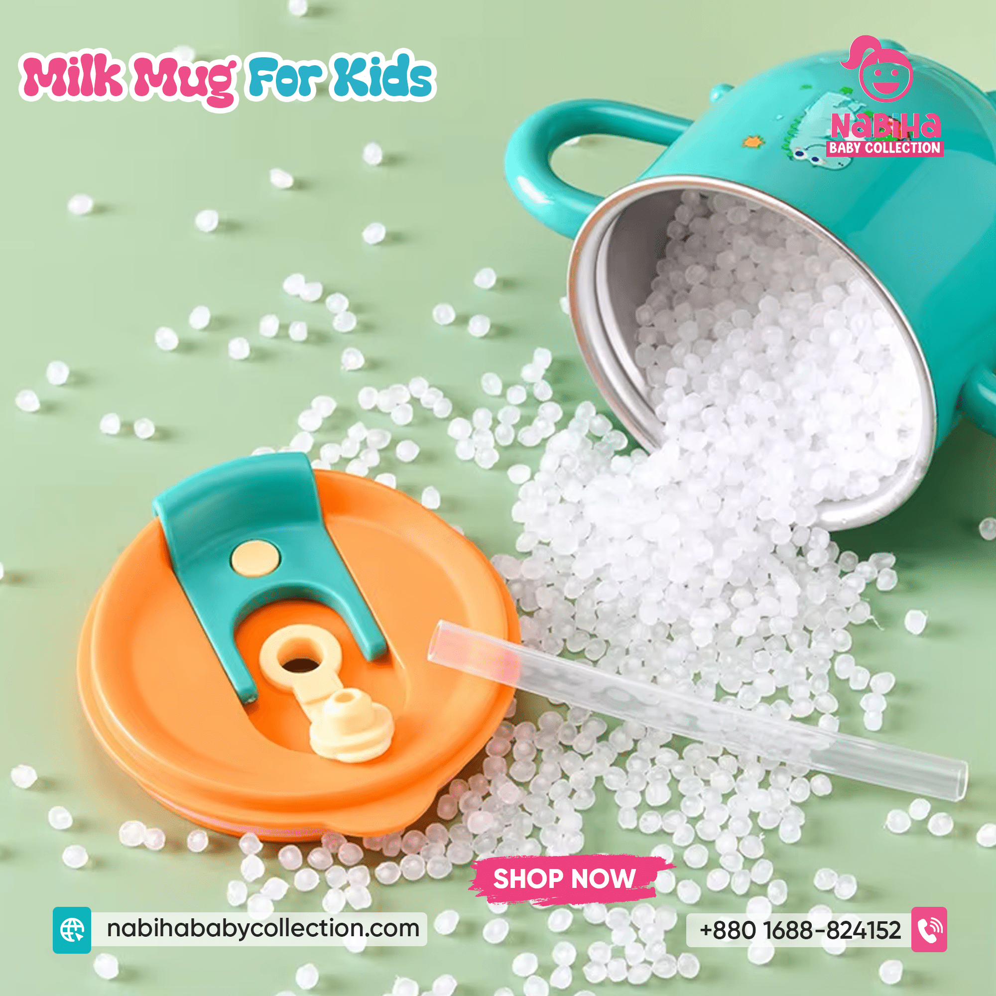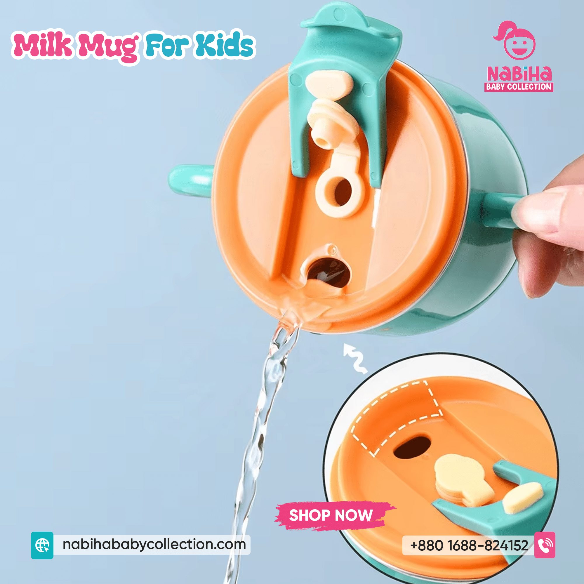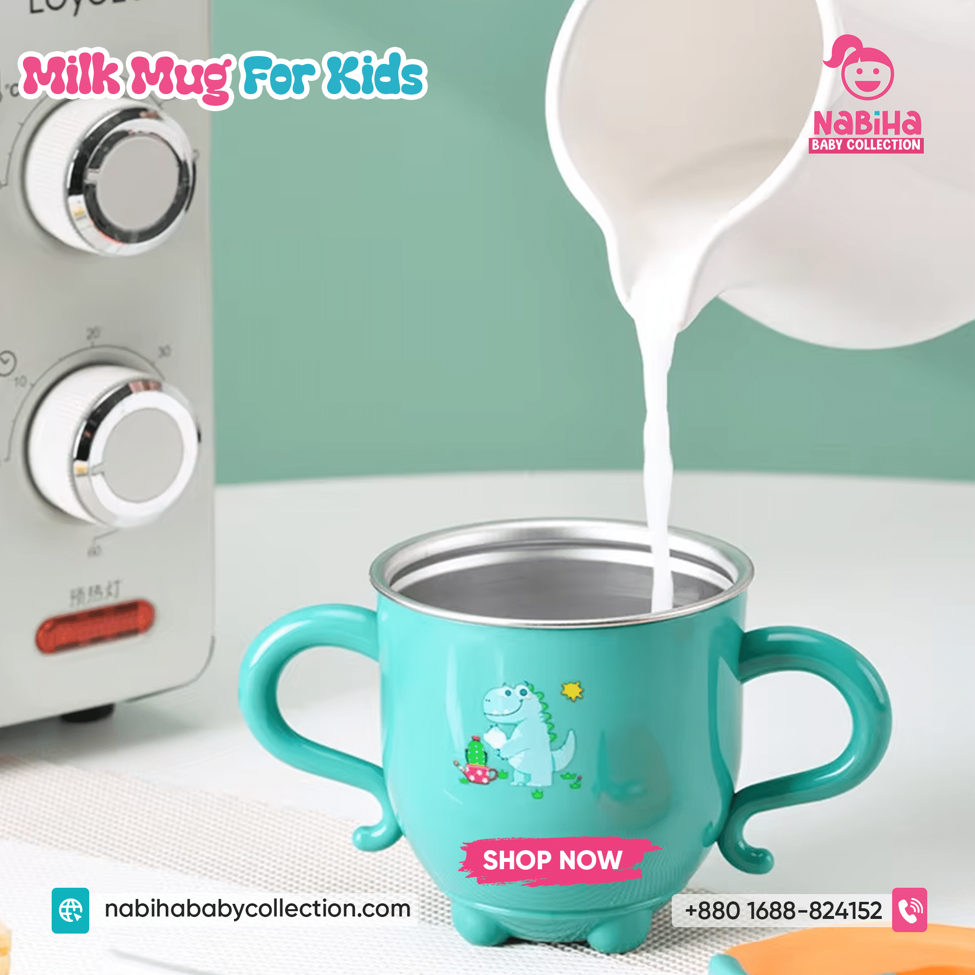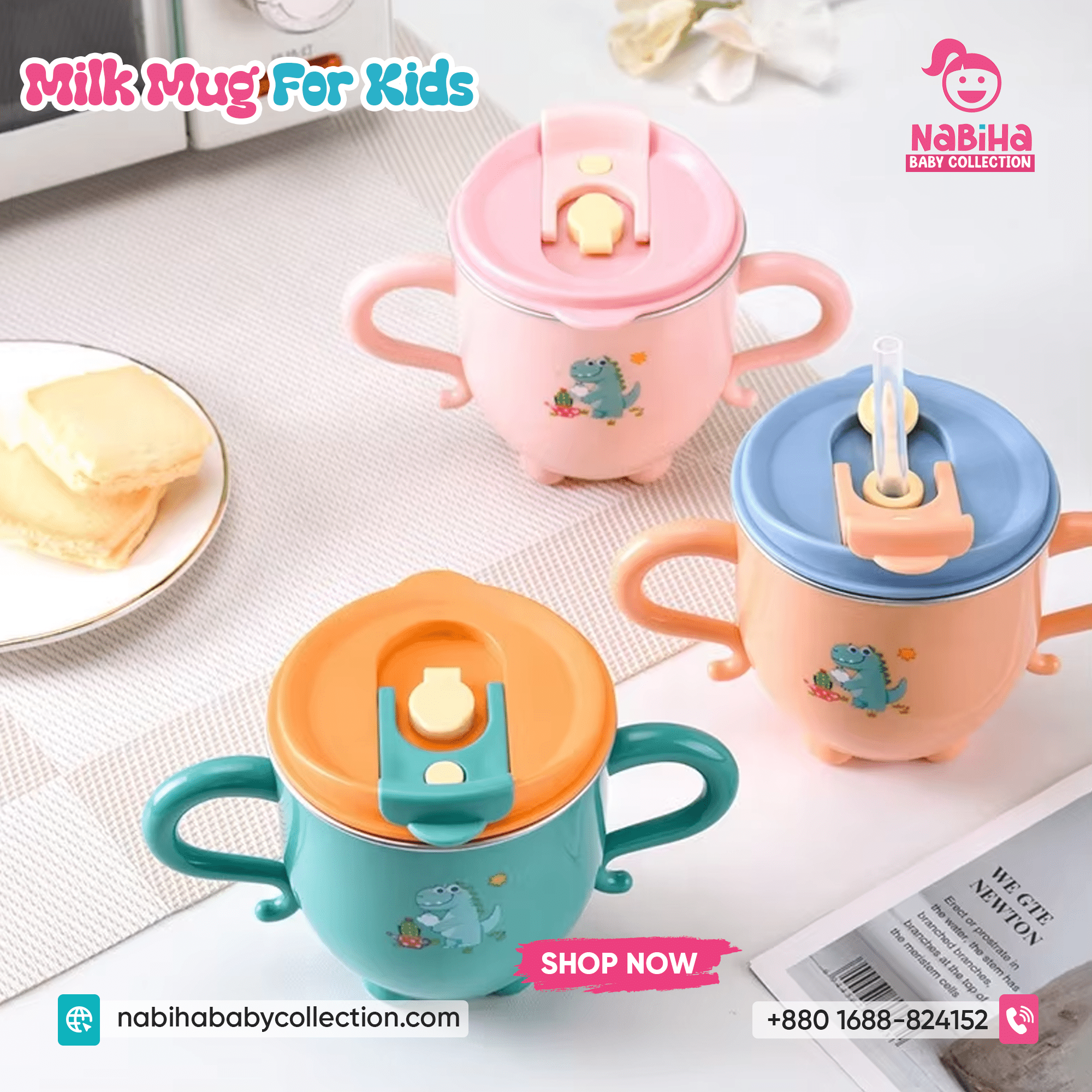 “Hi Nabiha Baby Collection, ami ‘Dinosaur Kids Water & Milk Mug’ nite chai. Color: [Green/Orange/Pink], Qty: 1. Delivery: [Dhaka/Outside]. Amar naam—, phone—, address—. Note: Dhaka ৳70, Outside ৳120. Rider-er samne check korbo. Hygiene policy bujhte perechi.