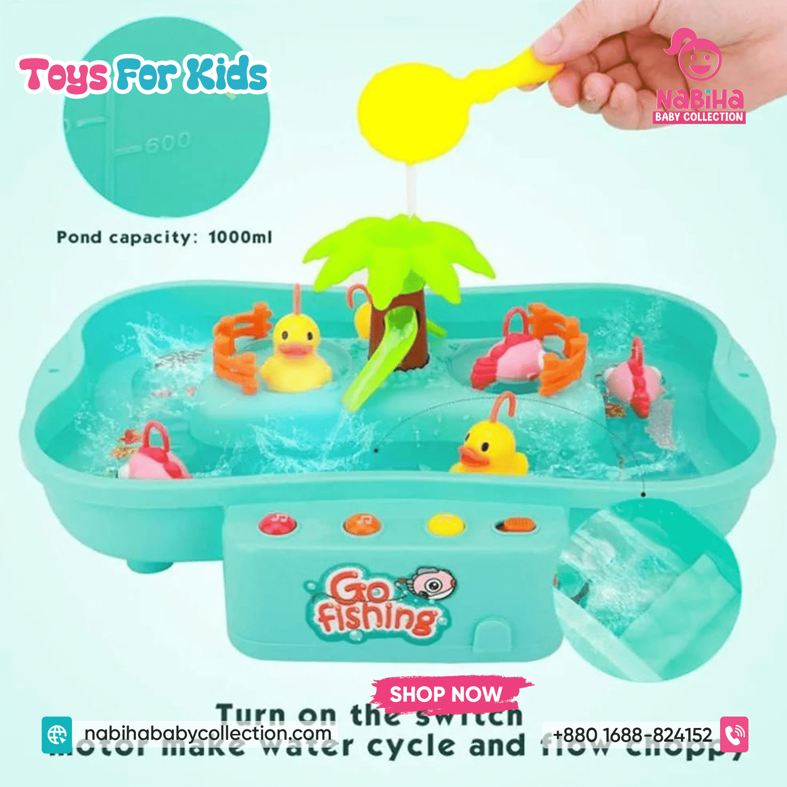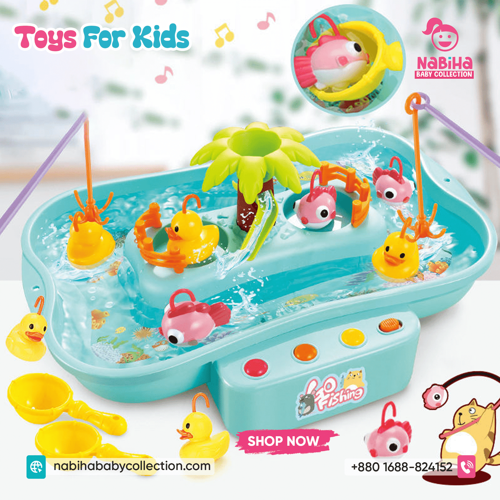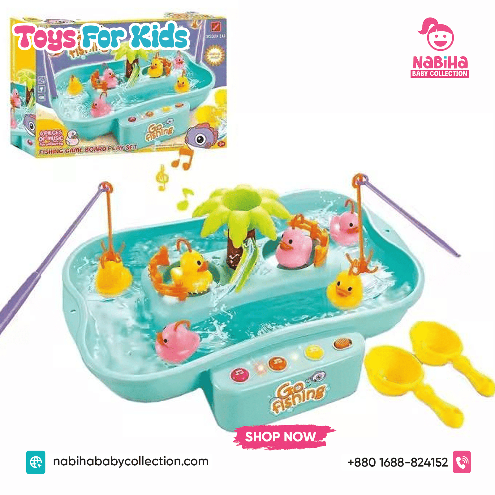 “Hi Nabiha Baby Collection, ami ‘Musical Water Fishing Game For Kids’ nite chai. Color: [Pink/Blue/Green], Qty: 1. Delivery: [Dhaka/Outside]. Amar naam—, phone—, address—. Note: Dhaka ৳70, Outside ৳120. Receive‑er somoy rider‑er samne function check korbo.