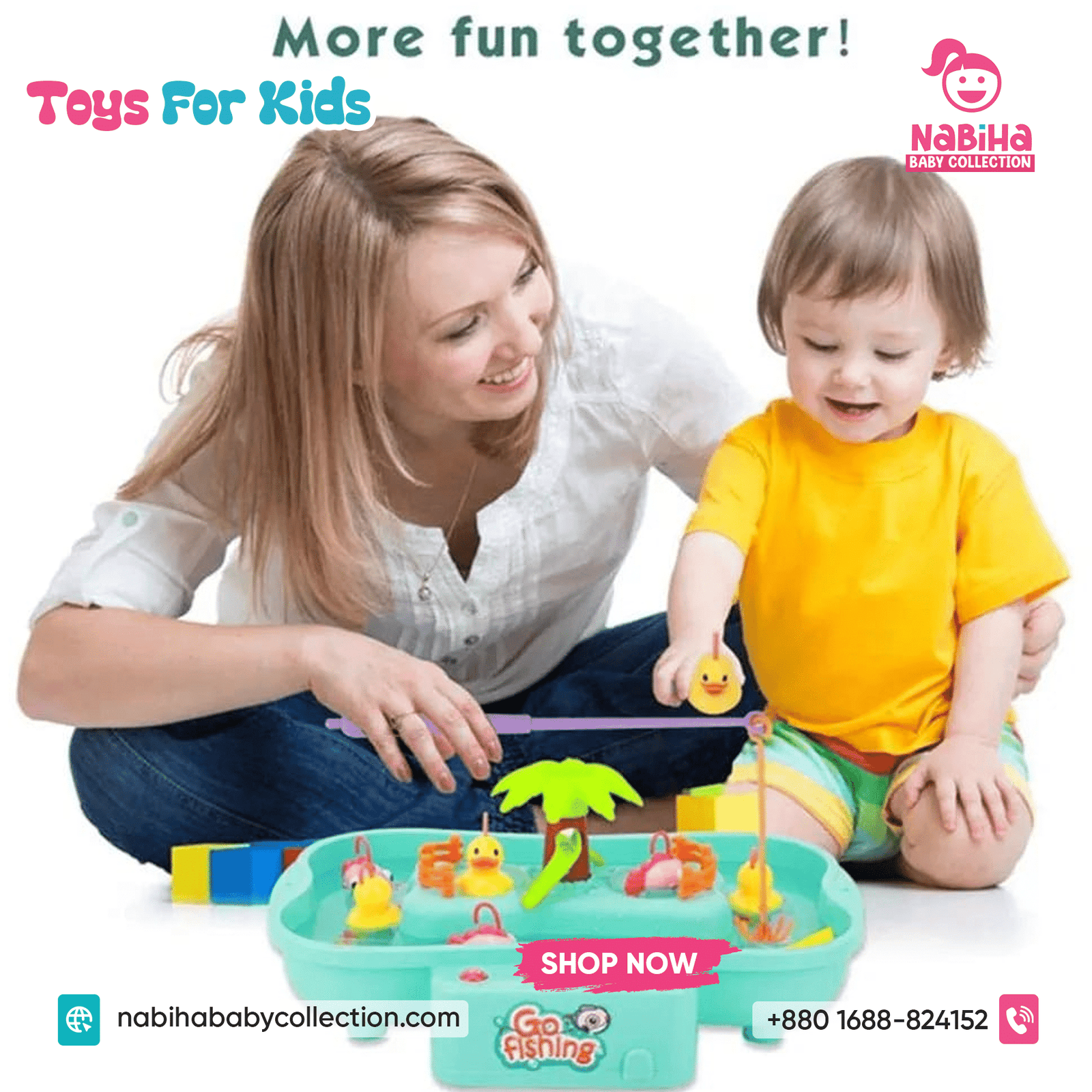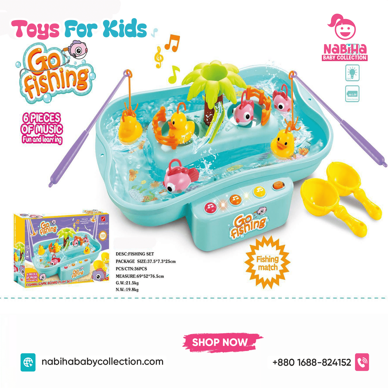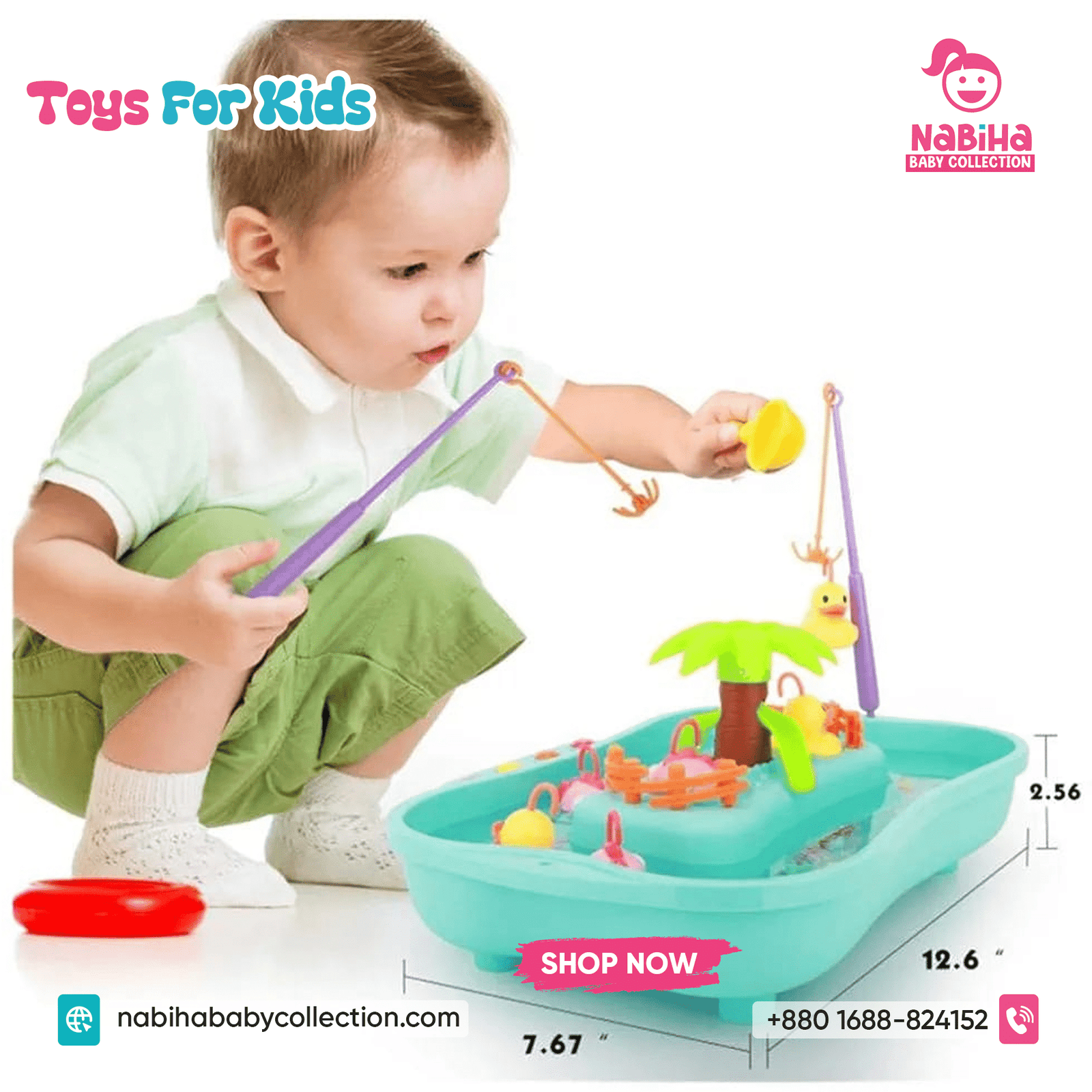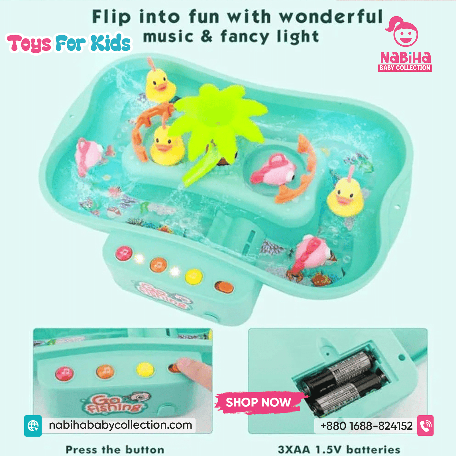 “Hi Nabiha Baby Collection, ami ‘Musical Water Fishing Game For Kids’ nite chai. Color: [Pink/Blue/Green], Qty: 1. Delivery: [Dhaka/Outside]. Amar naam—, phone—, address—. Note: Dhaka ৳70, Outside ৳120. Receive‑er somoy rider‑er samne function check korbo.