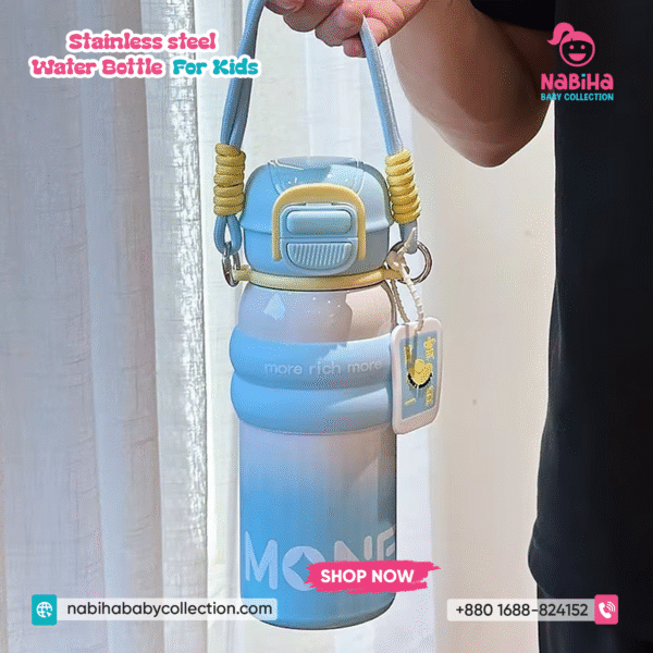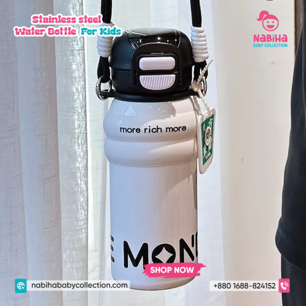 “Hi Nabiha Baby Collection, ami ‘Kids Insulated Stainless Steel Water Bottle (600 ml)’ nite chai. Print/Color: [White-Black/White-Red/White-Pink/White-Baby Blue], Qty: 1. Delivery: [Dhaka/Outside]. Amar naam—, phone—, address—. Note: Dhaka ৳70, Outside ৳120. Rider‑er samne color/print/lid‑lock/straw check korbo.”